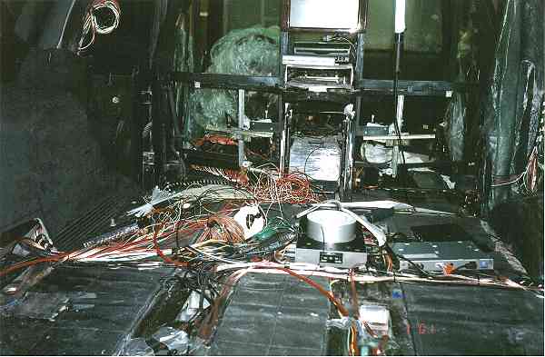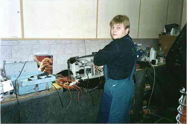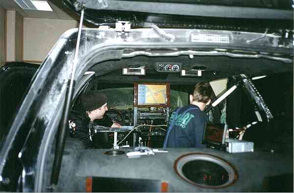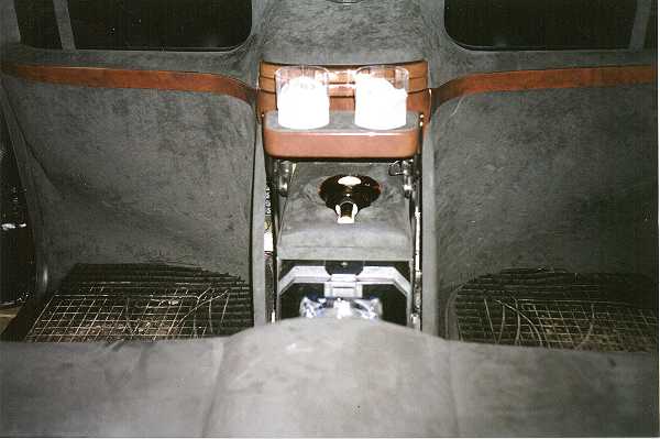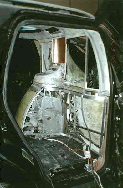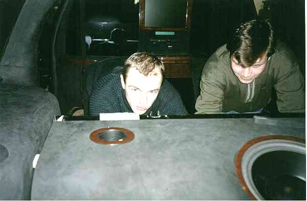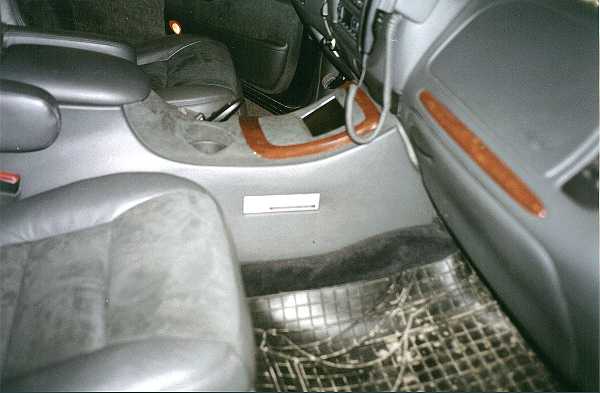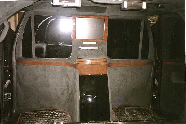 Саму работу , думаю лучше представить с её конечного внешнего вида, представленного в этом ряду фотографий. Это перегородка между водительским рядом сидений и хозяйским отсеком. Верхняя часть перегородки состоит из двух кривых угловых стёкол и двух прямых на электроподьёмниках. Все стёкла наглухо затонированы. Между стёклами установлен монитор в шпонированной рамке, под ним информационный ЖК дисплей, ещё ниже щель касетоприёмника видеомагнитофона. Ещё ниже разместились два чуда конструкторской мысли аля-Медведев, собственно два раздвижных стола и бар с холодильником. Работу столов и бара на сегодняшний день могу представить только в конечных точках по фотографиям, поскольку размещать видеозаписи в интернете пока не умею. |