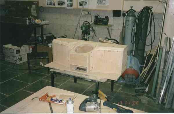 | Корпус саба помимо основной своей функции, относящейся к звуку, должен быть ещё основаниам для двух усилителей, DVD ченжера и кучи всякой электроники. После изготовления саб оклеен черным алькантаром и украшен шпонированными накладками на усилителях и кольцами на динамике и на портах фазоинверторов. |