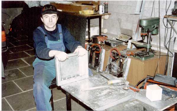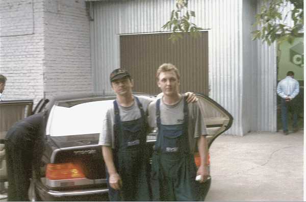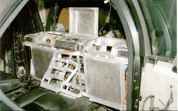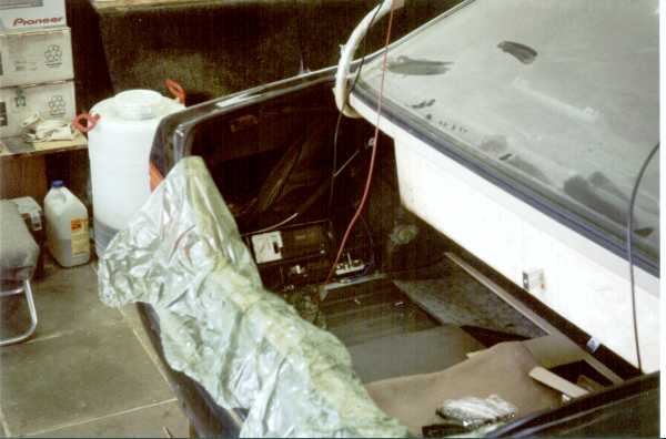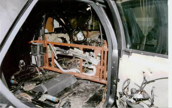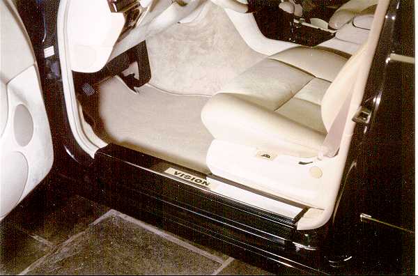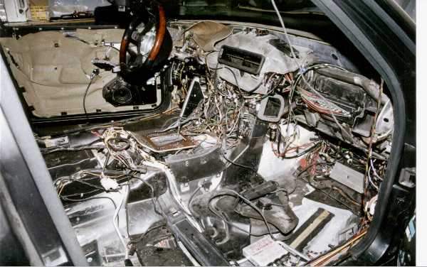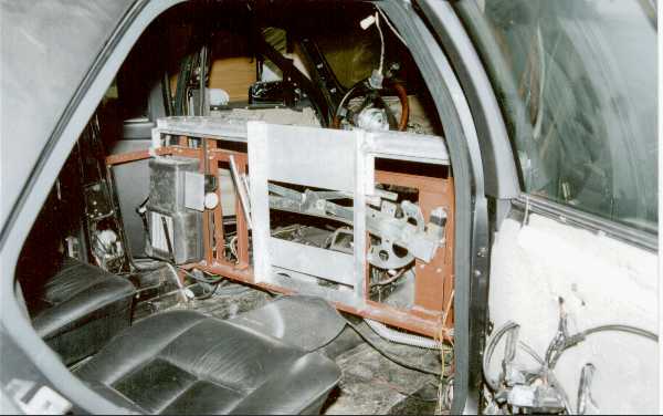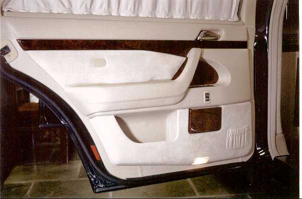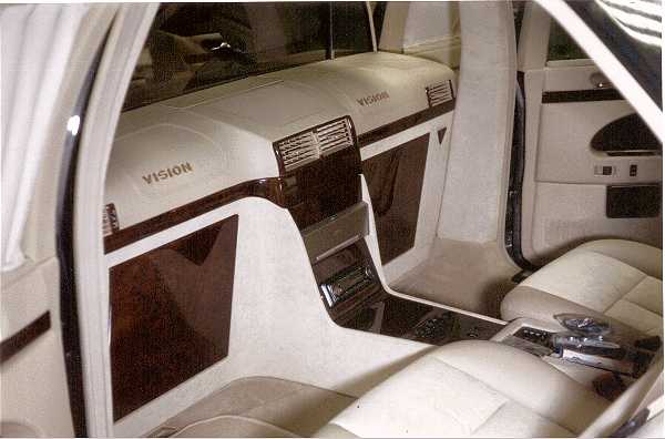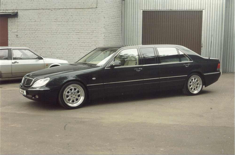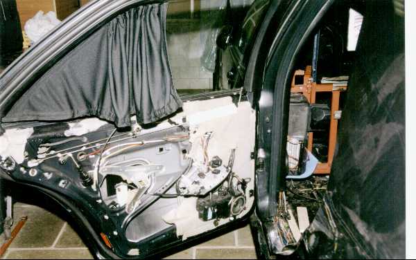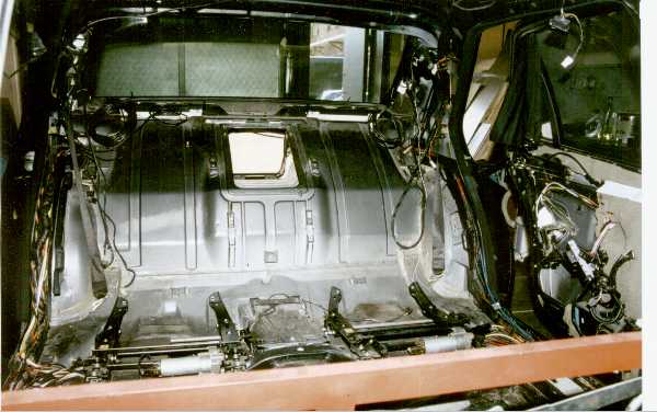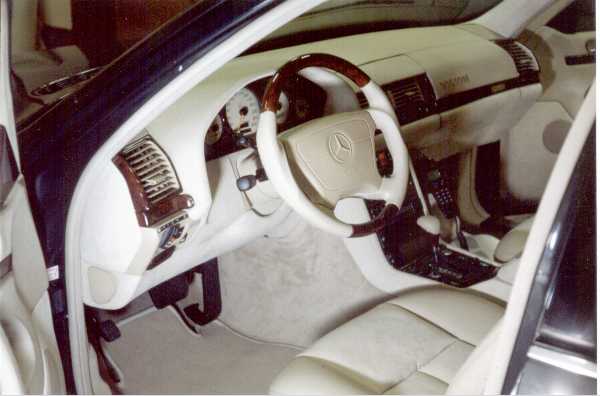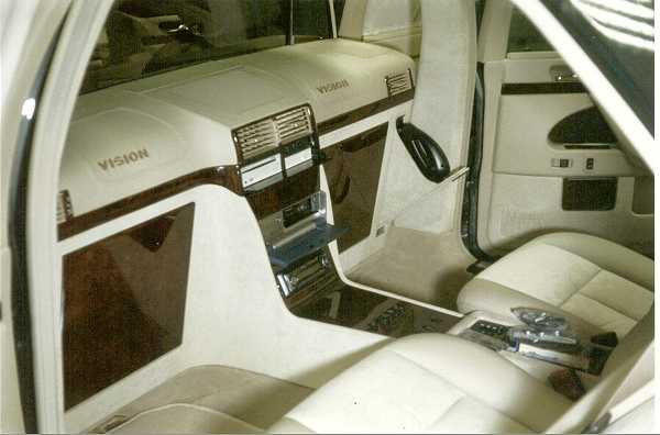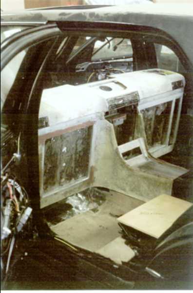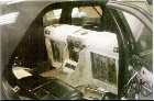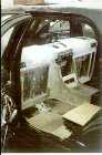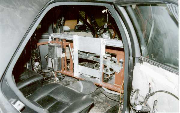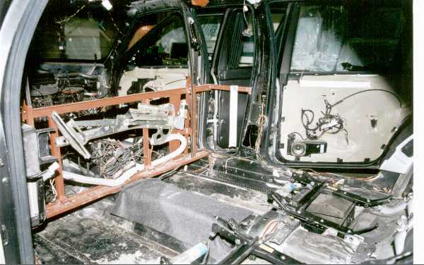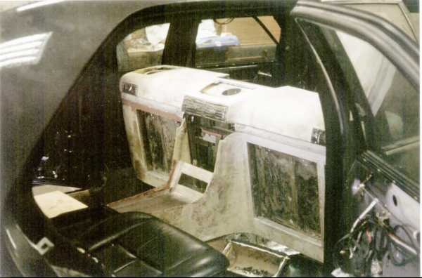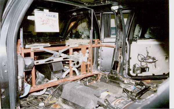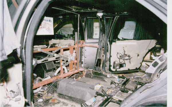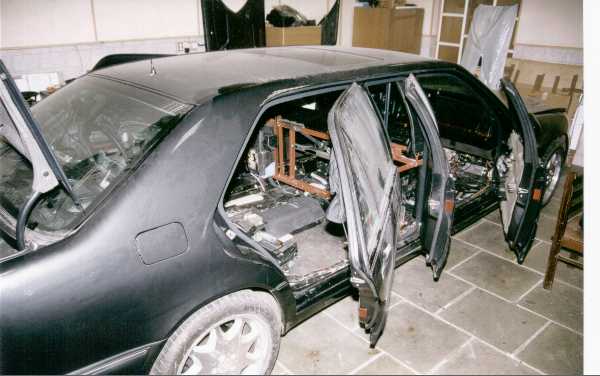 Собственно говоря, примерно вот с такого " набора автолюбителя" и началась наша работа над этим авто в конце января 2000 года. В салоне рабочим остался только механизм стекла-перегородки (на фото рыжего цвета грунтовка). Само стекло мы заказали заново на стекольном заводе - триплекс и зазеркалить со стороны водителя - таково было пожелание клиента. Ещё клиент пожелал, чтоб был телевизор *дюймов 15* , видеомагнитофон а ещё DVD., если это возможно, ну и всё такое ...в смысле музыки, плюс - должно быть обязательно для задних пассажиров два аирбега в центральной консоли и два в задних дверях, в задней части салона должен остаться свой кондиционер и свой обогреватель, у обоих пассажиров должны быть столики для работы, ну и самое главное : должно быть достаточно места для комфортных поездок, ведь это всё-таки Мерседес да к тому-же ещё и длинный.
