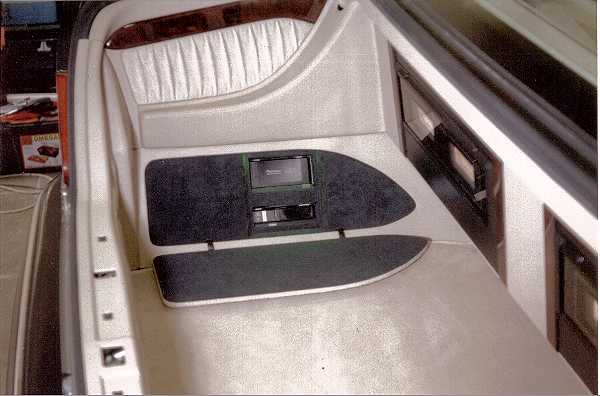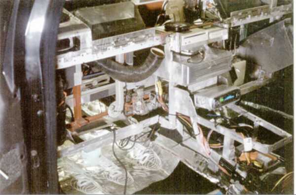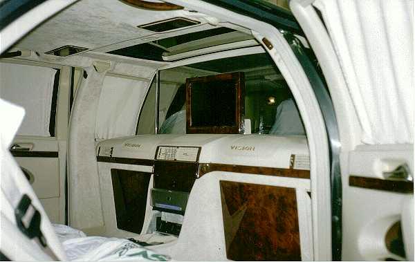 6)В пассажирском отсеке: вся акустика выполнена на базе MB Quart, два усилителя мощности McIntosh 4Х100 каждый, два головных устройства - AVмастер Pioneer 9000 c 6-дисковым DVD ченжером и минидисковая дека Pioneer 9100, видеомагнитофон JVC., Компьютер P3 - 650/256/10Г/DVD Pioneer 104s /FDD., беспроводная ИК клавиатура.