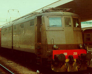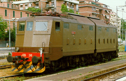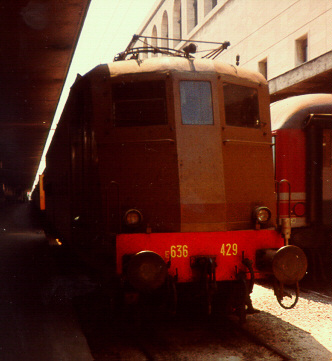 Dopo la pausa a causa della guerra la costruzione delle E 636 riprese,ma ci furono delle modifiche al progetto alla luce delle nuovi progressi tecnici e dell'esercizio delle prime macchine costruite. Infatti sulle macchine post-bellum i cuscinetti a strisciamento con lubrificazione a guancialetto, vennero sostituiti con quelli a rulli. Anche i motori vennero sostituiti con altri in quanto le caratteristiche tecniche degli stessi e del loro sistema di ancoraggio era fonte di un alto numero di guasti con costi di manutenzione troppo alti. Le macchine di prima costruzione erano dotate di motori tipo 32R (lo stesso delle E 626) che forniva però una potenza troppo bassa per i compiti a cui le macchine che lo avevano in dotazione erano assegnate. Cosi durante le consegne delle macchine successive ci furono delle modifiche non solo ai motori ma anche agli organi di trasmissione Nel 1951 le locomotive E 636.044 e 089 vennero equipaggiate con motori tipo 92 (lo stesso delle E 424) mentre le E 636.271-275 vennero dotate del tipo 32R5 derivato dal precedente ma con delle modifiche in modo da ottenere una regolazione della velocità molto più precisa e una potenza maggiore . Quest'ultima si ottenne anche grazie alla modifica della trasmissione col sistema a doppio albero cavo direttamente accoppiata col pignone del motore che permetteva di eliminare alcune ruote dentate. Le E 636 furono anche le prime macchine dotate del separatore D'Arbela come organo di protezione contro i sovraccarichi elettrici;questo era posto vicino ad un pantografo ed era dotato di valvola tipo Musso. Questo sistema venne sostituito a partire dal 1970 con gli interruttori extrarapidi. L'ultima modifica in ordine di tempo l'ha subita la E 636.284,che a seguito di una grave incidente ha avuto il cambio delle cabine;operazione eseguita nelle officine di Verona Porta Vescovo e solo sperimentalmente su questa unità. | in sosta a Roma Termini |