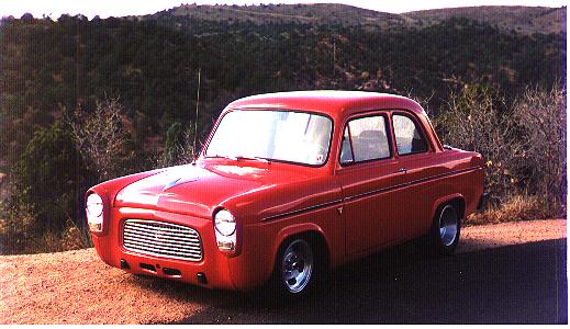 Here is a picture of my 1959 English Ford 100E Escort Drag Car. It is powered by a 302 cid Ford with a tunnel ram manifold and 2 500 cfm 2 barrel Holley carbs. It has a 2 speed power glide transmission with a 5500 stall speed Neal Chance 8" bolt together converter, MSD 7AL ignition system, Competition Cams roller cam and valve train,and a NOS plate nitrous oxide system. Rear gears are 4.11 with 28-10.5 Mickey Thompson slicks on a 8" Ford rear end supported by Art Morrison suspension components. The wheel base has been stretched from the original 87" to 91" to meet NHRA rules.The car is street legal and has run a best of 10.59 ET through the mufflers, on street tires,and with 91 octane pump gas and a 125hp nitrous setup. Its fastest ET & MPH are 9.93 at 132 mph at Pueblo , CO.