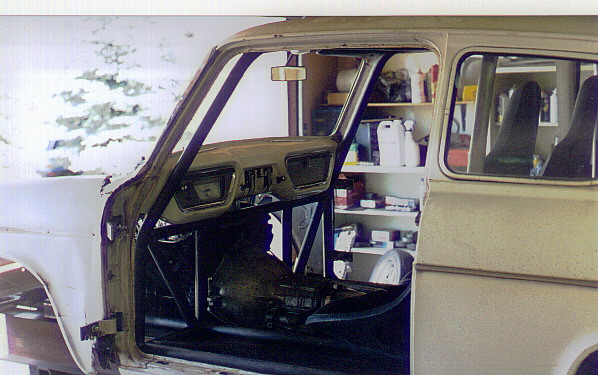 This is a shot of the firewall area of the car as the cage is going in. It is fully cross braced, but it is looking like I won't have much leg room. I need to do something about that... Hmmmmmmmm...(See photo 7 pictures up for the update.)