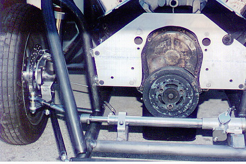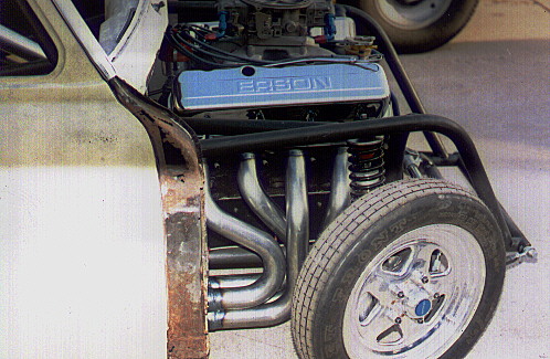 This is a shot of the car on the jig with the mock-up engine in place. It is not a very good picture and I hope to have a better one in the future.