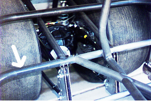 Here is how I made more leg room. The bar that is being pointed to was bent forward on each end to move the bar back aprox. 3" and the 4 link brackets were angle cut on the front side to angle them back to meet the cross bar. I also replaced the poly seats with aluminum seats to give me even more leg room. Anyone need some brand new poly seats with black covers? I am selling them for $100.00 for the pair and they have never been mounted.