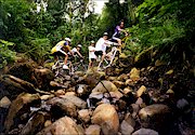 na trilha cheia de pedregulhos, colocar a bicicleta nas costas quando o