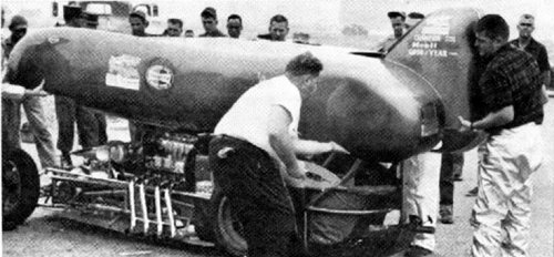 Mickey (right) and his crew lower streamlined body onto the "Attempt" record car. Car is fully enclosed. This picture was taken at March Air Force Base in 1962 |