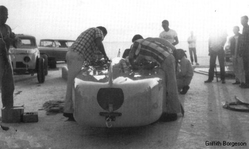 Challenger's first run on the Salt was made during the Bonneville National Speed Trials in late August of 1959. Here they are getting ready to go at dawn when the desert air is most still. |