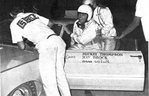 Here Mickey is seen jumping out of the 302 Mustang and Danny Ongais Takes over the driving chores. Mickey yells for the crew to add oil.