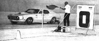 USAC's Joe Petrali flags Mickey off on the start of the 500-mile record run just at dusk. Standing start and flying start records were recorded for submission to FIA.