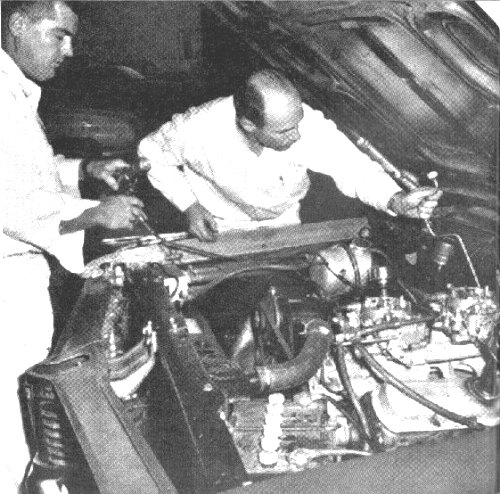 Mickey, left, and Lloyd Cox check timing on the 421-cubic inch V8 before making record assault. A broken rocker arm stud halted distance event. |