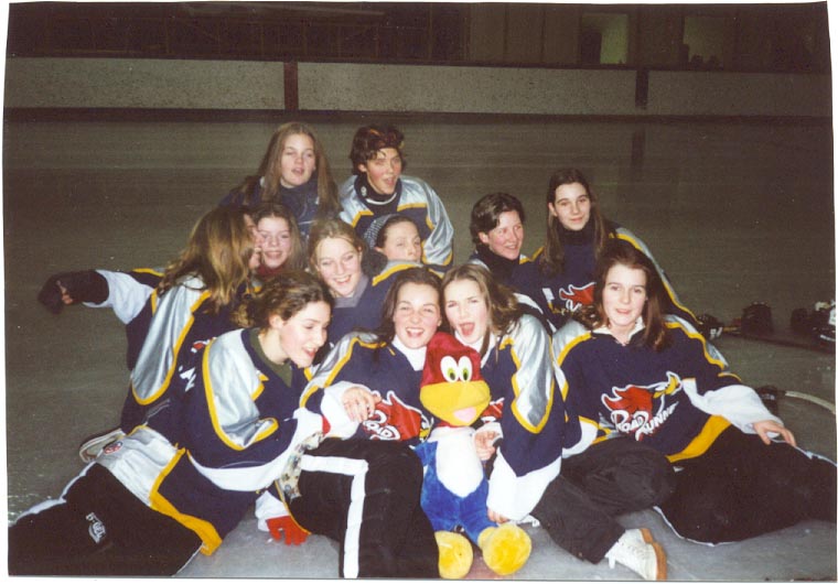 À partir du bas de gauche à droite: Andréa Tramblay, Josianne Tremblay, Roudy (la mascotte), Valérie Côté, Vicky Tremblay.