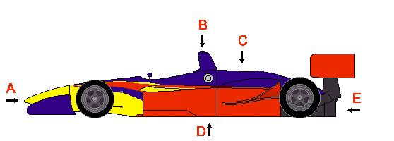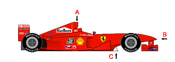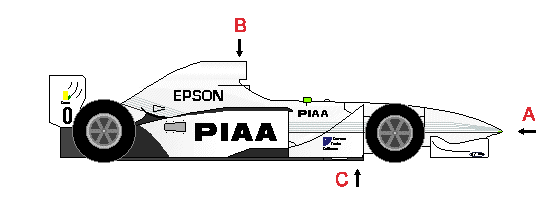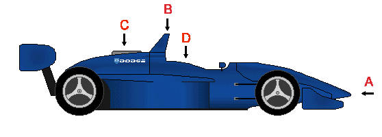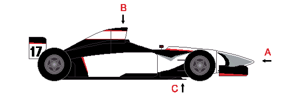 Large prominent Airbox above and behind the drivers head (A). High nose (B). Skidboard under the car sometimes visible (C). Flat bottomed with a rear diffuser. High narrow sidepods. Looks slim and nimble for a big car. Always seen at the track with an Identical twin. Each team builds their own cars usually with an exclusive engine deal from a major manufacturer.