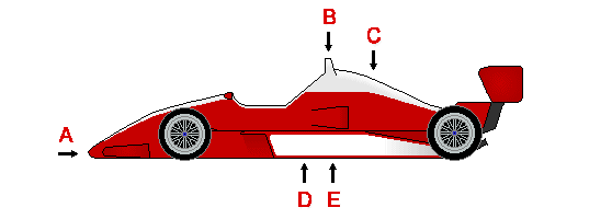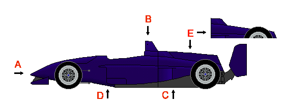 Prominent Airbox, larger and less sleek than on F1 cars (A). Low nose (B). Highly placed rear wing (C). Low wide sidepods. Has Venturi Tunnels (underwing) like CART cars. Impact attenuator strapped to the back of the gearbox (D). Deceptively heavy and ponderous looking, like the love child of a F1 and CART car that needs to go on a diet. Teams buy cars from Dallara, G-Force, and Riley & Scott and either build or lease engines constructed from Oldsmobile or Infinity produced parts.