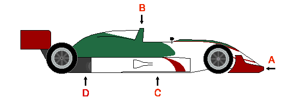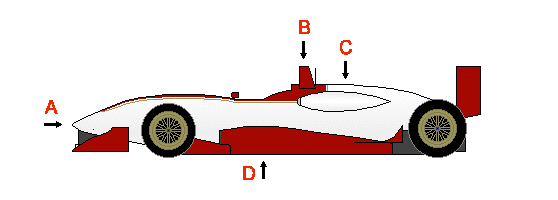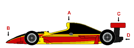 Slightly raised nose with a full width wing beneath (A). Prominent forward tilted roll bar. (B). Air inlet for the Engine visible in top of the car (C). High & wide head protecting cockpit side (D). All teams run the same Reynard chassis which are owned and maintained by the series. Flat bottomed with no ground effects. Slower than similarly sized Toyota Atlantic cars.