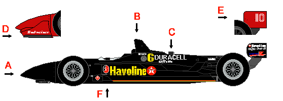 Low nose (A). No Airbox with a prominent roll over bar (B). Pop off valve limiting turbo boost protrudes from the back (C). Variable wing designs dependent on track type (D&E). Low wide sidepods. Visible Air inlet for the Venturi Tunnels (underwing ) beneath the car. (F). Sleek. Teams purchase chassis from Lola and Reynard and Lease engines from Ford, Honda, and Toyota.