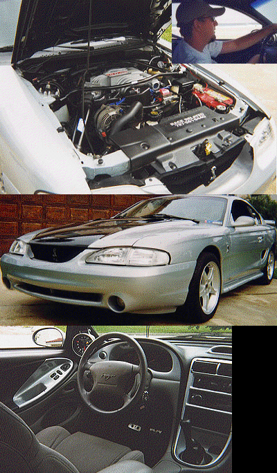 | This is my buddy craigs 1996 6 cyl conversion. The car now has a 5.0 and many extras. The suspension has been modified with Saleen Racecraft springs and Tokico 5 way adj shocks/struts, BBK caster/camber plates, Steeda upper and lower adj control arms, Steeda tubular front sway bar, adj rear bar. 1.72 rollers rockers, underdrive pulley's, MAC long tube headers an off road pipe, Borla XR-1 cat back system, 2 Rockford Fosgate XLC 12" subs a Sony head unit, and NEW 2000 full cobra interior. | ||||||||||||||||||||
