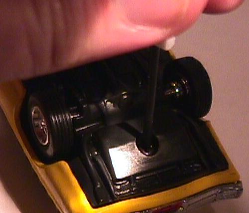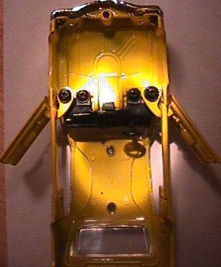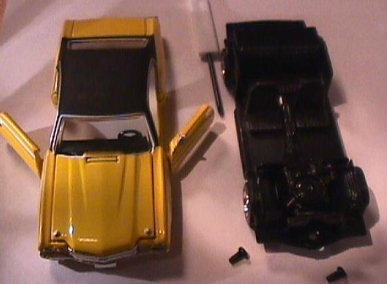 | This pic shows how the dashboard and door assemblies can easily be removed by removing the remaining four screws. Also note how the "glass" is attached to the inside roof of the model like a 1-6x model (like a Matchbox car). |