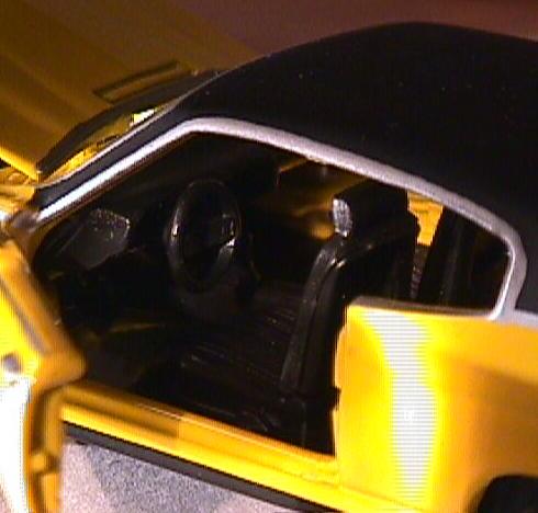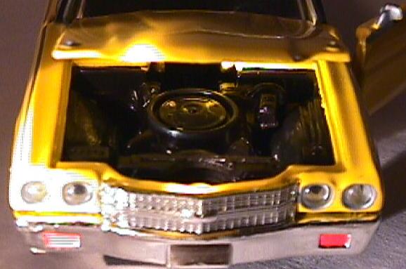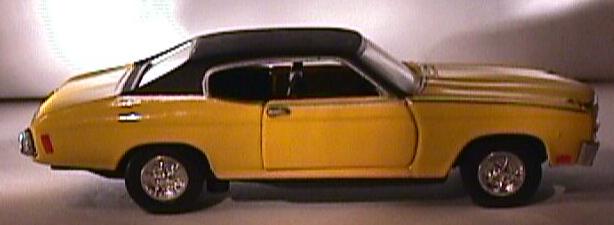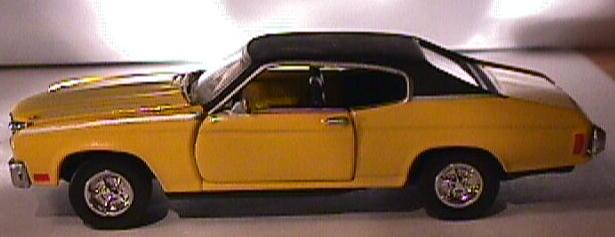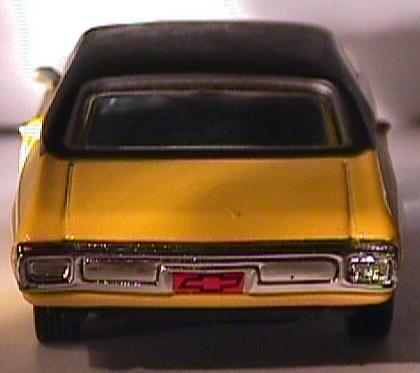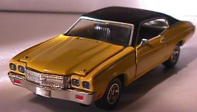 This model has a lot of positives but it has a few negatives as well. It has a very realistic chrome grille and chrome bumper with license plate frame and painted amber parking lights. It also has clear plastic molded headlights. Usually I give high points for this BUT they failed to put white or chrome backing behind the lights. The result is the lights appear abnormally dark. This takes away from the realism. The hood also has custom "hood locks" and they are highlighted in chrome. It has painted masks around the headlight assembly colour coded to the rest of the car. The hood opens (#6) which is good and the molded engine detail is good but it's flat black. The hood itself is not a terribly good fit as you can see in the first two pics and I take some points off for that. (#2) The rear of the model has plenty of great details including realistically molded tailights in the chrome bumper. But they aren't detailed in red. (#3 and #4) the sides of the model has some good and bad as well. It has painted marker lights on the front and rear and they are the proper shape in the proper location and they are the proper colour. BUT the "lights" in the rear are lacking the distinctive grill over the lights that the Chevelle was known for. The model has a silver pin stripe and silver trim around the windows and chrome side view mirror and door handle detail. The chrome wheels are designed to the GM standard which is good. But these wheels should be trimmed with the colour of the body and they aren't. Another nice feature of this model is the black vinyl top that contrasts nicely with the yellow body. The doors are a poor fit like the hood and that shows clearly in the pics. (#5) The interior is very nicely done with great details. The details can be seen when the doors are open it has the properly shaped steering wheel and molded dash board details. It also has tires that are some kind of rubber/plastic polymer. The model has good roll but it's not great. The body rattles so I take points off for that. The road feel is rough but the wheels do turn very freely and it rolls in a straight line. What I would do to improve it. If I were designing this model I would put chrome behind the headlights, white letters on the tires, colour coded detailing on the wheels and the put the grille over the rear marker lights. I would detail the tail lights in red and detail the engine and dashboard. And I would improve the body integrity. What's good about it? The best thing I can say about this model besides that it has excellent details even if they aren't realized, is that it can be customized. The whole thing is put together with screws. |
