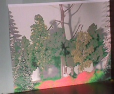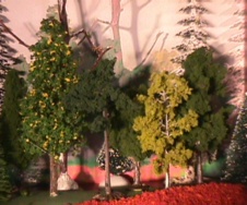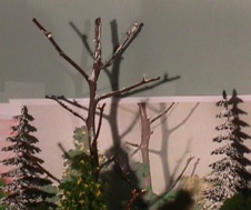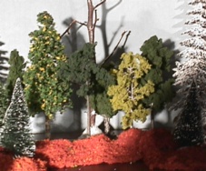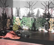 Now place the stand and the other trees back in front of the backdrop and photograph it AGAIN. The reason you do it twice is that the trees with a backdrop of trees behind them makes a much more realistic forest effect than just a few trees in front of gray paper. Of course you could produce the same effect with a good size photo of a forest from a magazine or something just make sure that the scale of the trees in the photo is consistent with your real trees. |