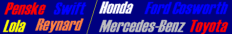 Owner: Roger Penske Chief Designer: John Travis Factory: Poole, England, UK First Champ Car: ? First Champ Car Win: 1978 World Championships: 8 1999 Chassis: PC27B 1999 Team: Team Penske Penske is the only team currently using its own chassis. The Penske Car record in the World Championship has seen its ups and downs. The constructor hit the low in the late eighties, forcing Team Penske to use March cars. Still, it has survived through difficult times and its Championship record is the best amonst the current competitors. The new PC27B car is an updated version of the 1998 car. Although the PC27 occasionally showed great potential, it often encountered reliability and handling problems. |