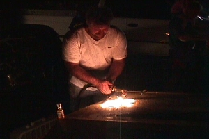 Here is Hubby torching a hole over the radiator cap so I can add water between heats. Won't overlook that one again when building a car!