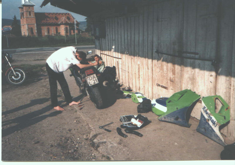 The romanians stood around and gave advise, but this time they were no help. All of them were two stroke drivers, so their knowledge could not match the problem. We stayed the night close by at a Lake and went the next day up in the mountains again.