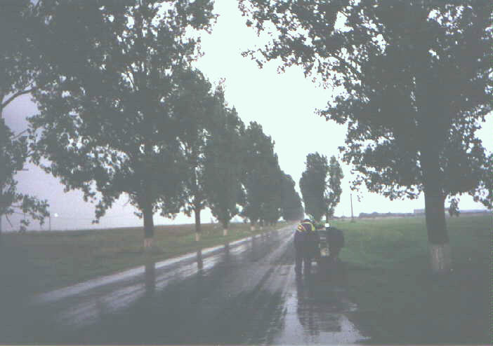 But before we had another unexpected stop because of the ZXR. Near Trebic, shortly after we had left the Motorway we recognised white cream in the ZXR's engine oil. Truely this was the first time I seriously thought that the ZXR can't reach home on it's own wheels. First I thought that the headgasket went down in cause of overheating from the damaged water cooling system. But there was nothing much we could do if it were like that. So we just changed the oil at a filling station to see how much water were already in the oil. But the oil was alright, on the long Motorway ride the engine's oil became to hot and the water was just condensing.