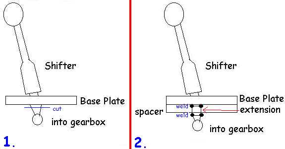 As you can see from the picture, the lever inside the gearbox is cut and an extension piece is added. Next make a spacer which replicates the original base plate - this should be the same thickness as the extension piece is long - otherwise the lower part of the lever will not line up inside the gearbox correctly. Also be sure that the welds are of a good standard otherwise if they break off inside the box, you are asking for trouble. Dont forget you will need longer bolts into the box now to accomodate the spacer. |