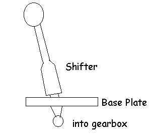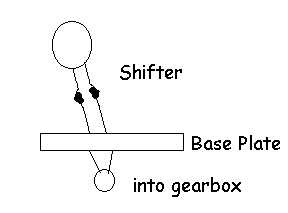 QUICK SHIFTER OK, this is a very simple addition to the above shifter modification. Basically, all you are doing is moving the pivot point so as to get the shifter throws shorter without cutting the size of the shifter down. Simple leverage principals.. Only drawback is that the shifter is a little harder to move - not really a concern seeing as most car gearboxes are resonably easy to move anyway. See the below diagram for an idea of what im talking about.