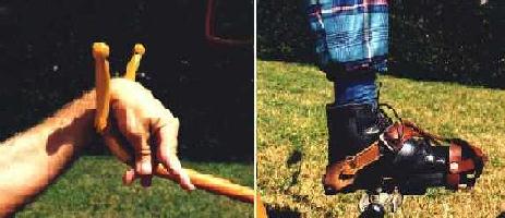 Il sistema sterzante � affidato ad un asta collegata al manubrio che termina con una forcella nella quale inserisco il mio polso, onde evitare che mi sfugga la presa; dei pattini fissati ai pedali impediscono ai malfermi di piedi di scivolare via!!!