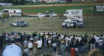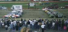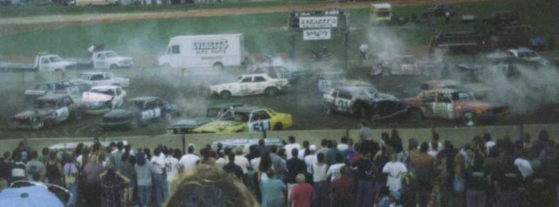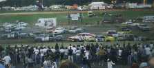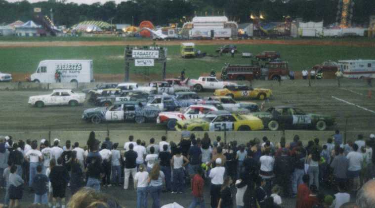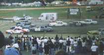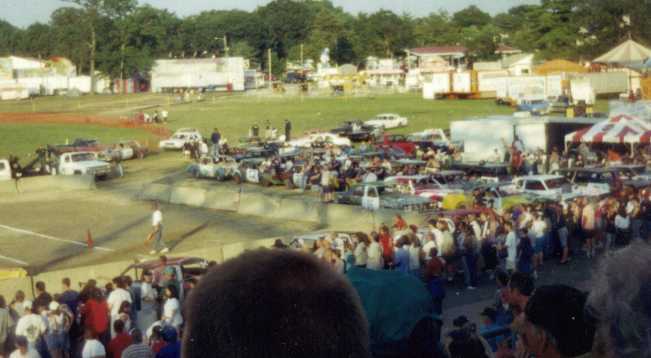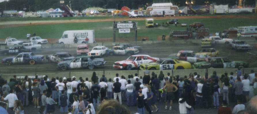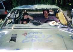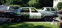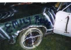 The next morning, there were about half a dozen crews out there performing various repairs to their cars. My dad, Tim, Jim, and myself loaded my tools up and we trekked down there to peice the battered Olds together. I actually stole a tire from Jim's derby car to replace the blown one on mine. We tore the rest of the bumper off and found that the bumper pistons made rather nice spears. We discarded the wrecked tire and cut away a large section of the fender, enough to allow free movement of the new tire. Unbelievably, none of the steering linkage was touched by the massive onslaught of blows. We replaced the top hose and refilled the radiator as well as replaced a busted belt. We cut away a lot of the inner wheel well as most of it was on the carb and we discovered that the exaust header on that side was broken off. That gave the car a most hellacious roar. The final step was to remove the fiberglass nose. When we were done, the car looked and sounded evil. I wish we could have gotten some shots of it and recorded the engine sound.