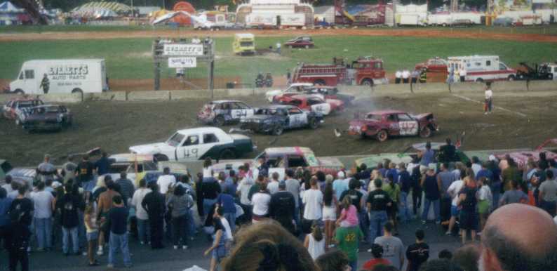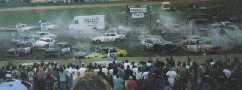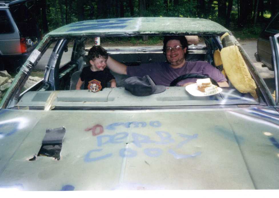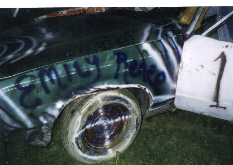 The heat was short and extremely violent for me. Because of the muck, it seemed like Route 98 was in slow motion, despite all that awesome power. I was immediately tackled by the two other 'big cars' in the heat. I didn't see the first blast coming; a big mid-70's Monte Carlo came smashing into my front corner, which left crippling damage. Four other hits came in quick succession in the space of ten seconds in the same general area. I take full responsibility for the disaster. Where as the previous years, I could account my losses due to bad luck, inferior car, whatever. This was plain old human error on my behalf. I didn't pull up far enough after the first hit and I was paying attention and ol' Route 98 payed the price. I felt like the U.S.S. Enterprise after she'd just been crippled: drifting and without impulse power. Actually, the car never thought of stalling. Each successive hit pushed me into some poor dude, whose battery took a header. Pushed me so flat actually, that the driver side of the car started flattening out.