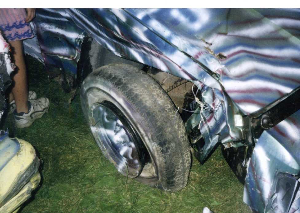 That's the front passenger quarter. It was absolutley mangled. Further back, the door was pushed in about 2 feet. Notice the fender is sitting BEHIND the tire. No wonder I couldn't turn the wheel.