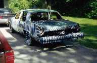 Building this car was an easy task as I already knew just about every inch of her. The rug was so messed up, that we ended up pulling it up in clumps rather than cutting it out. We also discovered that the quarter panels were VERY rusted under the chrome trim. The bottoms of all the doors and fenders were literally gone. This would weaken the sides considerabley down the line. One interesting and morbid and very questionable find was the in the rear seat. I ripped out the back seat cushions and proceeded to cut the seat covers off of them so that I could use the foam elsewhere and I discovered that both cushions had a massive blood stain on the inside! It was as if someone had bled quite a bit back there at some point in the car's long history. The stain was were the small of your back would be and flowed down. It was pretty freaky! Tim had no idea where it came from either! Something negative happened in that old car. It's funny. You own a car for X amount of years (Tim owed it since '90 or '92) and no one ever had any ideas what secrets it still held. I built the car utilizing some new ideas, such as hammering the trunk and quarters, and I had a new way to chain the tank on. I started smashing a grip into the hood to open it (I had neglected to do this over the years and ended up slicing my hands up every time I went to open the hood). I reinforced the seat as the seat was in pretty sad shape. The car was brutal. With a small tap on the gas pedal, I easily left 20 feet of rubber.