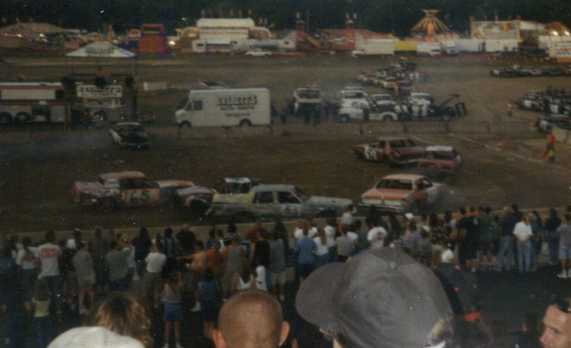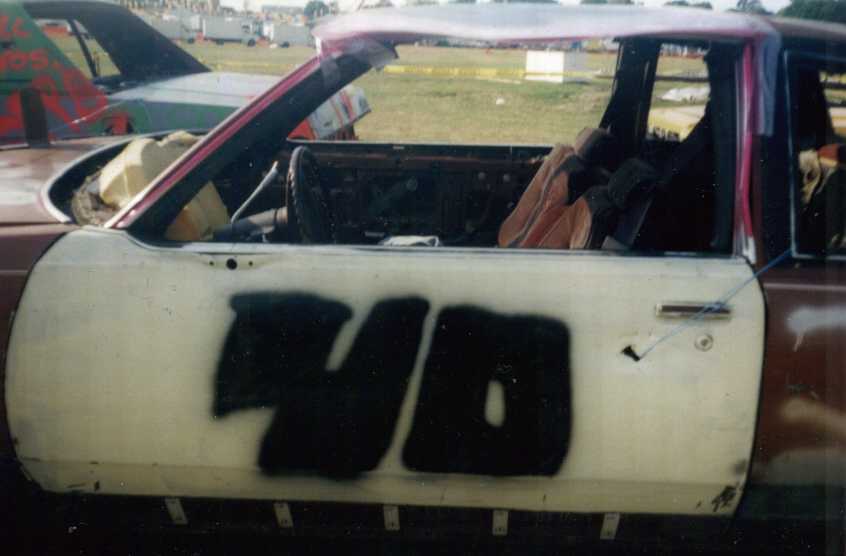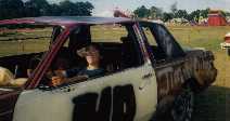 The car itself was in pretty good shape. One side was stoved in a bit when a pickup truck backed into it and there was a iny amount of rot on the quarters, but that was it. The engine ran strong, despite the fact that it leaked oil. My brother could peel out for up to a minute or more before the car would move, creating a great noxious cloud of burned rubber. The first big issue was would they allow the car at all? The car was a T-top, but I have seen T-tops there in the past. The safe bet was to call JMP and ask them what we could do. They told us to rivet or weld sheet metal to it and that would suffice. Hey, we could do that! Jim did most of the building himself as I was busy building Edgecrusher at about the same time. Jim knew the rules, he could do a good job. And he did! He went out and bought a whole bunch of ducting steel and rented a rivet gun and riveted a roof onto the car. Probably his one big boo boo was that he removed the ENTIRE dashboard. Technically that's against the rules, plus he hosed his ignition wiring. Dad fix the wiring in 2.5 seconds (where the rest of us were looking at it dumbly), but he needed advice about what to do about the missing dash. He came with me the first day I drove Edgecrusher and he talked to Ron, the head official (and a hell of a guy). Ron told him that all he had to do was pad the hell out of the dash area. See, that's one of the real cool things about the officials where we run. They want everybody to run and have fun. I think that's cool! So, Jim ran home and used his rear seat cushion to pad the cockpit. The car was ready to drive on the same day that my Edgecrusher was going for it's second heat, so we made a family thing out of it. I lent him a fresh battery and a good promise to tow his ride to the fairgrounds. We promised to beat the snot out of each other should we end up in the same heat. He would have definantly come out on the sharp end of it with that one, as my car was three times the size of his.