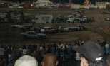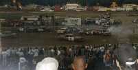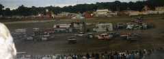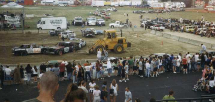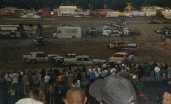 We knew right away that the Regal was a total loss when the front end loader hoisted the car in the air and the whole front tire assembly fell off and was hanging by the remanents of the tie rod. The front of the car was mangled beyond mangled. The rear actually started bending up and the car never stalled or lost power. Jim was a gentleman's gentlaman about the situation and he did what most others probably wouldn't. He hunted down the kid he smashed (who came in 2nd place) and made sure that he was ok. The kid said afterward that was stunned when he felt the door hit his hip. He just had the wind knocked out of him. That just proved that there is a few weaknesses to the old idea of keeping your driver door facing the traffic. Sometimes that plan backfires and you get your clock cleaned. Jim and the kid hugged and wished each other well and then it was off to see me and the Edgecrusher do battle (Ha). Jim wasn't too upset that his car was destroyed after he'd been DQ'd and no one gave him trouble over the hit. Jim was mainly concerned that the officials would ban him from competing again. After Edgecrusher flopped and died, I was so fustrated at the stinky wagon that I gave it to Jim. We both went over to the officials table where they were signing up drivers for the next days races and asked if we could transfer my entry fee to Jim, since I never got Edgecrusher on the track. They agreed to do that. Unfortunatly for Jim, not even he and the mechanical genius dad could get Edgecrusher back to a running state so Jim's season had come to a close. After that, Jim gave me my battery back and we left.