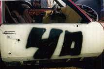 As you can see, Jim was very active during the heat. he always kept moving and hit as hard as he could. In many respects he was driving smarter than he did last year, but he was definantly driving more crazy too! Unfortunatly, Jim's reach for glory was cut short by an incredible peice of bad luck/timing. After Jim sped cross the track and welted a massive hit on someone over there, he immediatly kicked it into reverse and sped after a guy in an early 80's Caprice in reverse. Jim picked up speed steadily (the regal was battered but running superbly) and he tried aiming for the Caprices rear tire. The Caprice suddenly cut the wheel and stopped at the same time Jim got tapped. The end result was disasterous for Jim. I can't tell you how fast he was going, but he was moving a quick clip and the rear of his car catapulted into the driver door of the Caprice so hard that the driver in the Caprice practically hit the passenger door. The driver door was obliterated and the guy stayed down. The crowd suddenly became silent, the drivers in the pit (including myself) looked on in worry, and the heat was stopped. Jim was horrified at what had happened. The fire guys came over to see if the guy was alright and he sprung back up from the seat, apparently only stunned a bit. The officials then DQ'd Jim for an excessive driver door hit. Jim yelled over to the kid (this was his 1st derby!) and asked if he was ok. The kid yelled back that he was goig to get Jim, but Jim told him that he was already out. The get them smiled and said 'Yeah I'm ok.' Apparently, no one else thought it was ok though. Even though Jim had been DQ'd and therefore shut down, he still was the recipient of several hard blows. At least three cars hit him at full speed in the driver front tire. I have to believe that it was a little retribution for a nasty illegal hit. On Jim's defense though, it really was an act of misfortune. Jim drives crazy and may get carried away sometimes, but I know that he means not to hurt anyone. He really felt bad about almost killing the kid on his first derby.