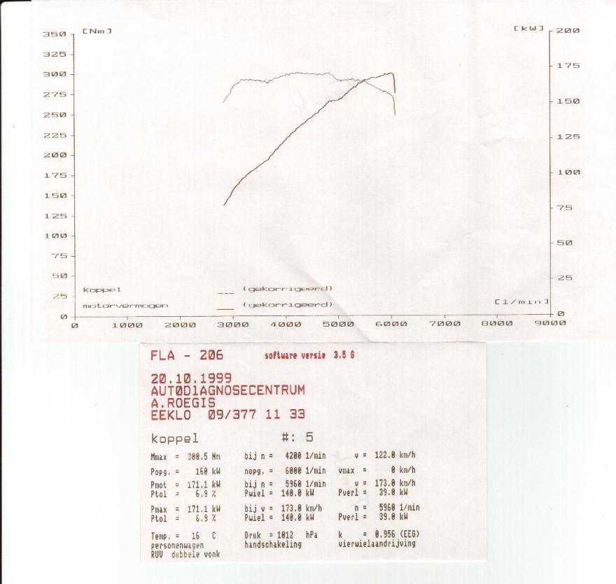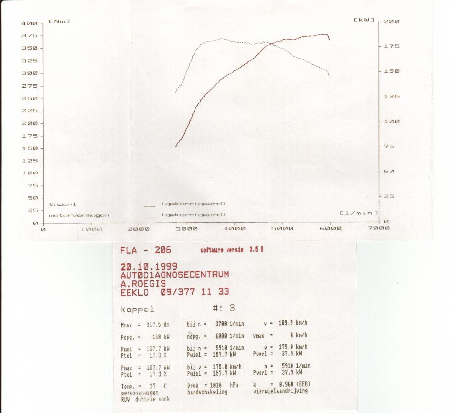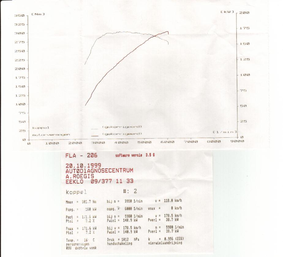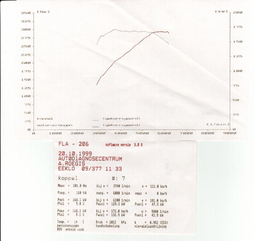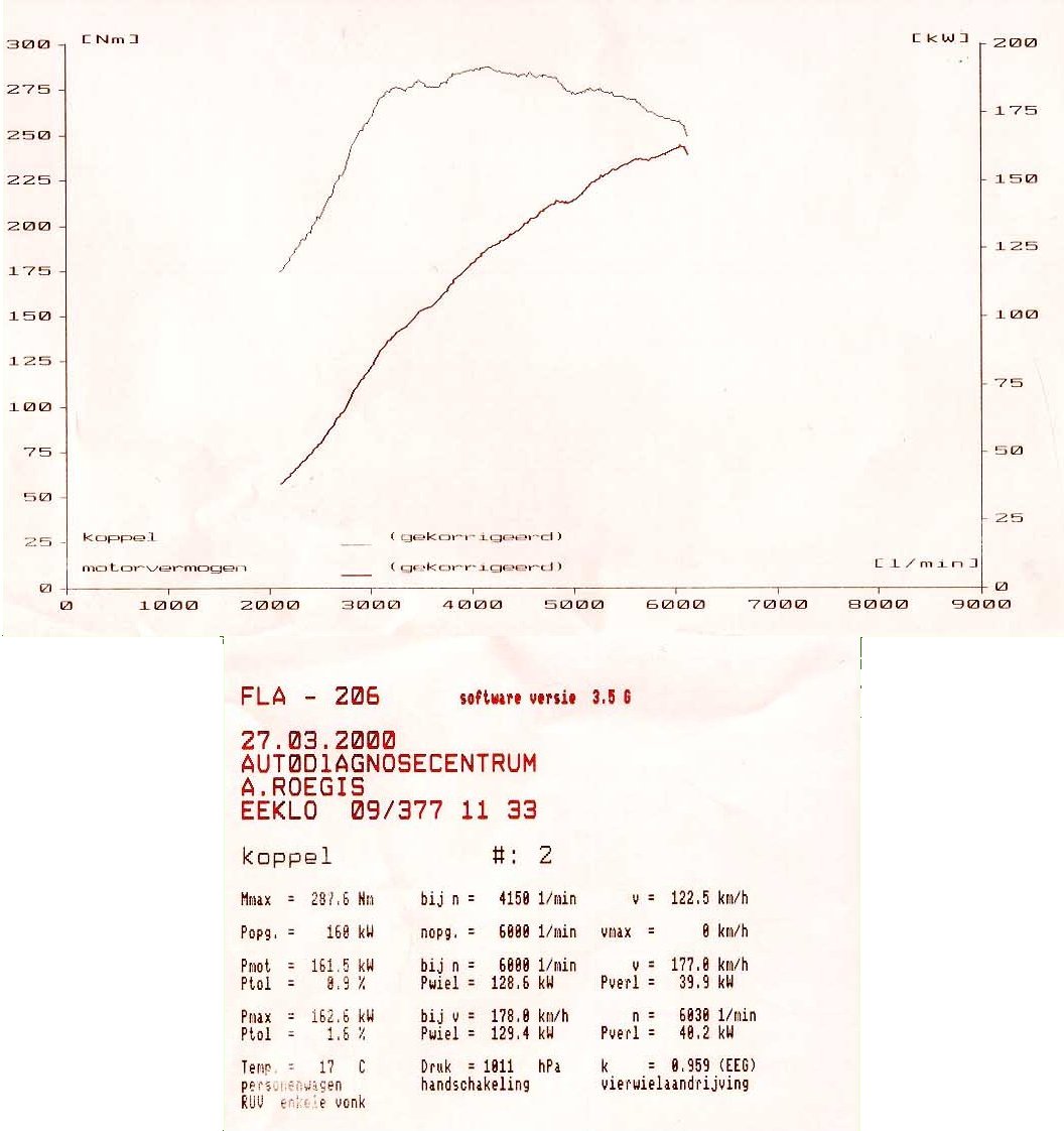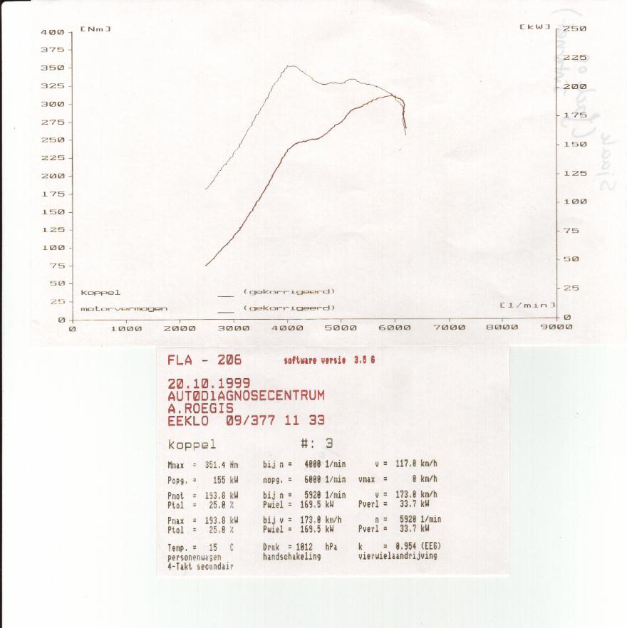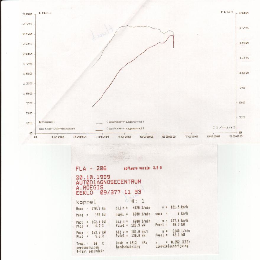 | Max. kW aan de wielen | 97,7 kW / 132,9 pk.- 5970 Rpm - 170,0 km/h | 20-10-1999 K&N Electronic Boost Controller ERL water injectie |