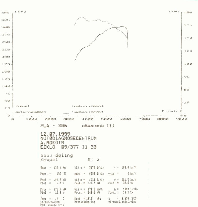 | Max. kW aan de wielen | 148,3 kW / 201,7 pk.- 5860 Rpm - 174,0 km/h | ||