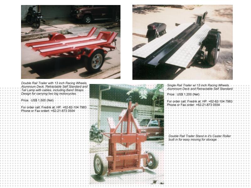 PLEASE COMING BACK OFTEN TO CHECK OUR NEW PRODUCTS AND PRICING IN THIS PAGES. THE WORKSHOP WE BUILD Trailer to transport Big Motor Bike and Jet Ski IN ANY MODEL, WE ALSO CAN BUILD TO SUITE YOUR NEED. Click the thumbnail to enlarge the pictures to it's actual size for pricing