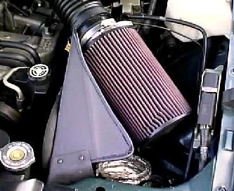 I wish I had the V8!!!!! However I did not want to spend 5K more on the jeep just to get the bigger engine. So I decided to add some power to my truck....oh...oH..OH! I wanted my truck to breathe better so I decided to build an intake system. However in 1995 no one made an intake kit for Grand Cherokees. (I designed and built my intake system before K&N marketed their Kit!!!!) We decided to use a K&N conical filter designed for a Mustang 5.0 for more free breathing. (This filter is huge!! about 9" long and 4" in diameter!!!) After removing the stock air box and tubing, I fabricated a adapter piece of 3" PVC piping cut two inches long to adapt the intake hose to the cone filter. Using hose clamps and a fabricated aluminum bracket, I mounted the cone on to the intake hose and stableized it using the aluminum bracket. After fabricating this intake system, I realized that the fan was blowing HOT engine air on the air filter which counteracts performance. Thus I fabricated an intake wall to shield the intake air from the engine. I also mounted a duct from the lower front of the jeep to route colder, denser air to the intake system. (In theory, it sounds like it works) Two years later K&N decide to market a design similar to mine. (Great minds think a like?) I felt a small improvement on responsiveness and high end power and could hear the intake at 3500RPMs. |
