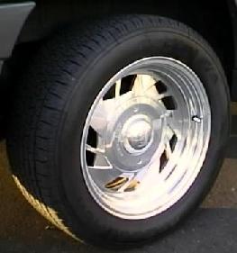 | From the beginning when I bought my jeep, I knew I wanted to change the rims and tires.(Rims were 15 X 7 and tires were Goodyear 215 75 15, these rims and tires were not going to give me any performance off road or on road!) As soon as my first set of tires wore out, I bought a set of 15 X 8 Centerline Hammer polished aluminum rims and BFGoodrich 255 60 15 radial TAs. These rims had a 4" offset (stock is 4 1/2") making my rims and tires stick out. I now had a wider track and beefier tires, handling was improved dramatically.After a couple of years, I decided to stagger my sizes of tires. (I could fit bigger tires in the rear.) I used 255 60 15 in the front, and 275 60 15 in the rear. This also helped to create an even larger track and more tire surface area on the road, however, by changing to a larger diameter rear tire, the jeep looses acceleration. I also realized, by using a taller tire "60 series", this creates a lot of tire flex, which reduces handling characteristics. Also by staggering tire sizes, there can be no tire rotation, causing the tires to wear down faster. Upon learning this my current tire and rim combination has changed. I decided to go with a larger rim, to reduce tire flexing and a shorter tire "50 series". The current tire and rim combination is a set of 16 X 8 Centerline Saber polished aluminum wheel with a 4 1/2" off set. The tires are BFGoodrich 245 50 16 Touring TAs. This tire and wheel combination made my jeep seem even more lower. I feel this is the best combination of handling, acceleration, and ride. | ![]() |