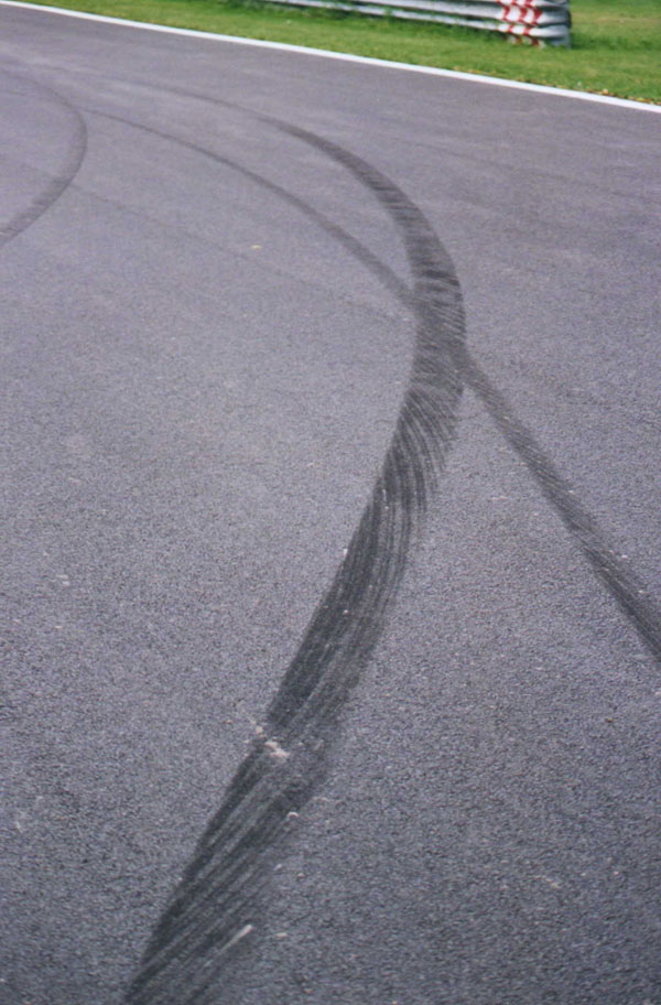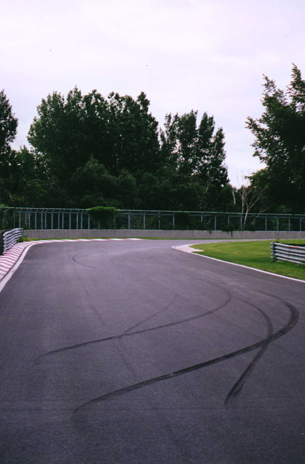 This happend on my third third time around, i went faster and faster everytime i hit this chicane (same place where Oliver Panis wiped out and broke his legs) and this time I was going too fast ----> you know what happens next, the end comes out and you freak out and let go of the gas pedal, this puts the weight of the car in the front so, it makes the end come out even more and wipe out. . Click to see the full view and a close up of the tread marks I left...