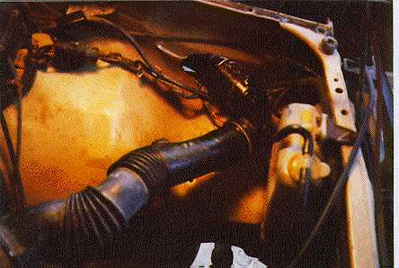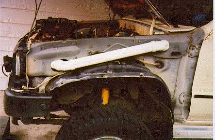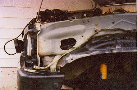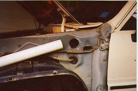 Then I took off the fender and cut out a hole in the front of the engine compartment wall. There was already a hole there, which was used for running wires.