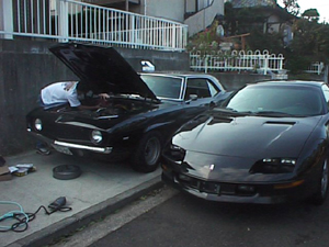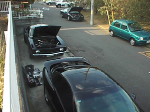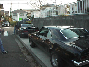 佐藤モータースのガレージ 入りきらなくて後ろの方でフードを開けてるのは TOKAのカマロ |