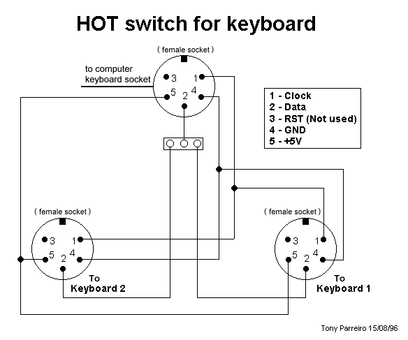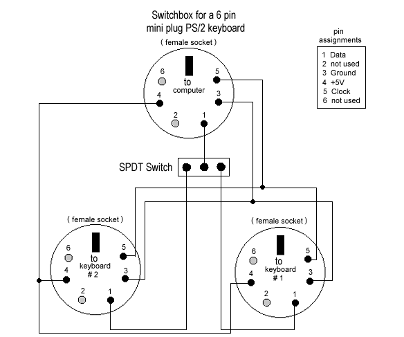 Thanks to Tony Parreiro, here's a diagram for a switch box that allows you to have both keyboards plugged in at the same time. You can flip back and forth from your wheel keyboard to the regular one by means of a SPDT switch.