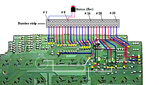 Circuit board 1 - The circuit board that you see above is from a cheap keyboard that I purchased at a computer show for $12. You can see the pairs of contacts that the keys strike to activate letters, numbers, and commands. I've circled the F12 contacts to illustrate how they are traced to other points on the board. The points in this case are dots of solder where resistors are attached to the printed circuits on the matrix. Using a continuity meter, I traced 25 of these points that connect with all the "key" contact points on the matrix. When used in different combinations, they produce strokes of any keys on the keyboard. For example, if I hook up a switch to points 16 & 20, I can produce the F12 function key. The white lines represent continuity between the key contacts and the dots of solder. Tracing these can be a real pain in the neck, but it's worth the hastle. Just take your time and be methodical. Use a permanent marker (razor point) to mark these areas. I started with the "Esc" key putting one probe of the continuity meter on one of the contacts, and then slid the other probe on all the solder dots until I found the one that produced a beep from the meter. That means they're connected or you have continuity. Immediately, I jotted down the results i.e., Esc=8+1. Continue with this process until you've traced all the keys, or traced the ones that you'll need. I opted to trace them all so that later on I could connect wires from all 25 points to a barrier strip. From the barrier strip, I can hook up a button for any key that I need. Simply number the lugs on the barrier strip to coincide with the numbers on the solder points. Then, refer to your chart for which two lugs to connect for any given key command. The illustration above shows how this is done and as an example, I've shown how I would hook up a button to give the Esc command.