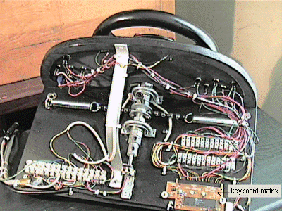 This is how my wheel looks from the back. The keyboard matrix in this picture is from another keyboard that I purchased from Computer City. It's smaller than the one that I spoke of before because, it didn't have a hard circuitboard. Instead, the circuit board was a sheet of mylar that plugged into the small matrix shown in the photo. If you can get a keyboard that's similar, then you'll find it not as difficult to trace. All the connections are in a line directly below the insert plug for the mylar circuit sheet.