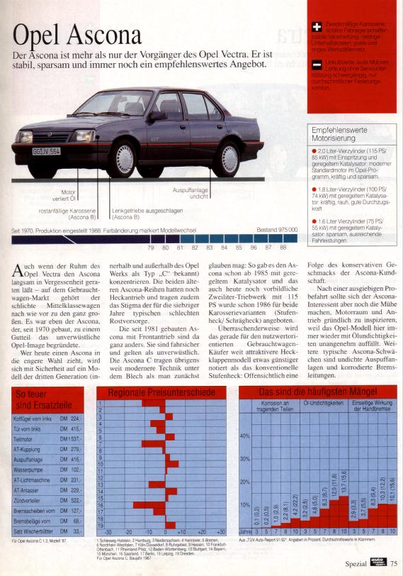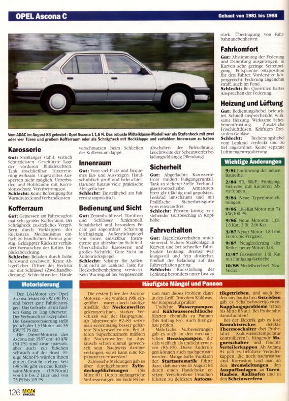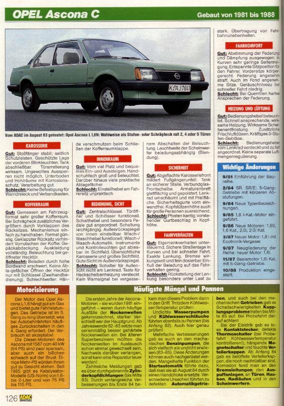 Whoever has to decide wether to buy an Ascona or not, has to be aware that type A and B (see also overwiew) are only suitable for experts and/or enthusiasts. For the technology is too old , getting parts too difficult and the condition of those cars is mostly just bad. Better suitable for normal driving ist the C series. It provides quite modern technology ,